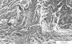 圖5為疲勞條紋形態(tài),其條紋主要為韌性條帶,此時(shí)條帶相對(duì)較窄而當(dāng)裂紋進(jìn)一步擴(kuò)展時(shí)裂紋條帶逐漸變寬,從圖中還可以看到疲勞裂紋條帶較為粗大,二次裂紋非常多,即破壞已相當(dāng)嚴(yán)重。此時(shí)已預(yù)示著吊鉤的壽命快到盡頭了。